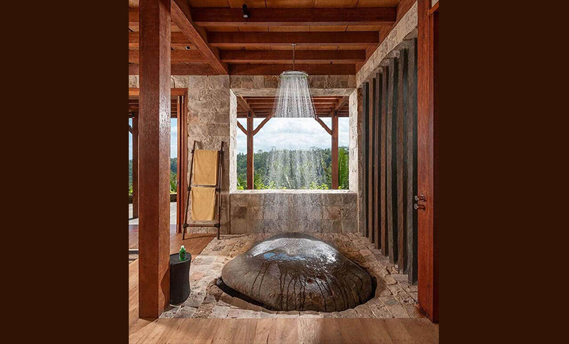 This design is certainly enough to make any grown person shed tears. Don’t get us wrong, but this shower looks completely breathtaking. Looking at the scenery behind it, you could say that there’s not a better location for it. Moreover, the rainfall shower looks absolutely majestic and relaxing. It certainly makes for an excellent addition to a romantic getaway. However, there’s one unexplained rock that has our attention.